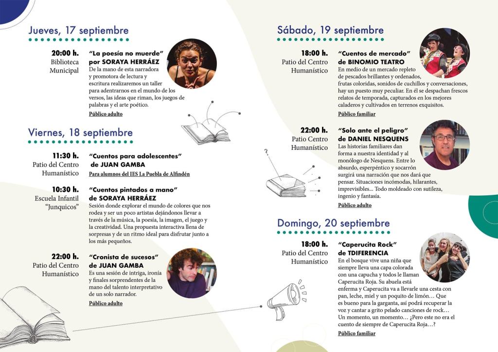 Durante todo el fin de semana, del 17 al 20 de septiembre, en el patio del Centro Humanístico (edificio Abdalá Musaire) y en la Biblioteca Pública, vecinos, visitantes y seres curiosos, tienen una cita con escritores y narradores: Daniel Nesquens, Juan Gamba, Binomio Teatro y TDiferencia.