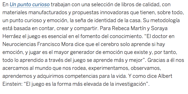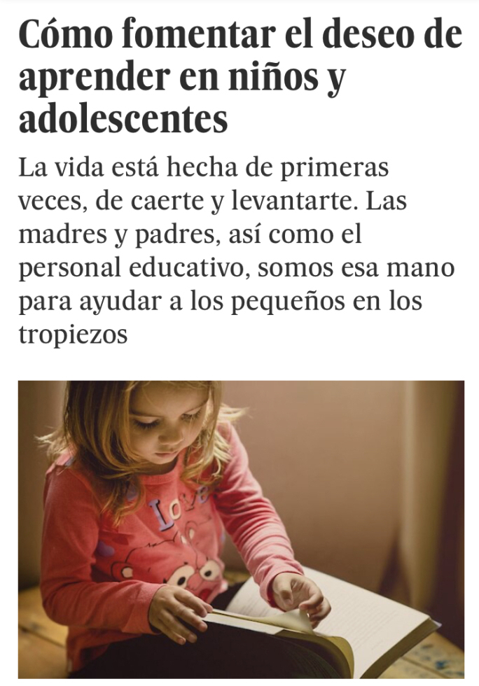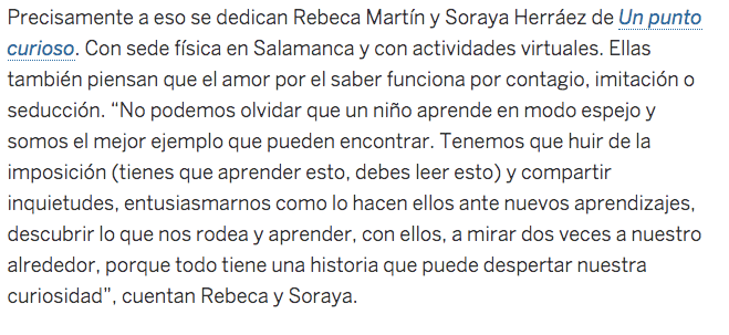 Hay momentos que las buenas noticias llegan en el momento adecuado. Y eso es lo que nos ha pasado esta mañana. Hoy salimos en El País en la sección De Mamas & De Papas gracias a Rocío Niebla, hablando sobre curiosidad, lectura y aprendizaje https://elpais.com/mamas-papas/2020-11-20/como-fomentar-el-deseo-de-aprender-en-ninos-y-adolescentes.html junto a Juan Santiago Mellado (profesor de lengua y literatura del Instituto María Zambrano del El Espinar, Segovia) y Estefanía del Pozo (maestra de infantil y psicopedagoga).