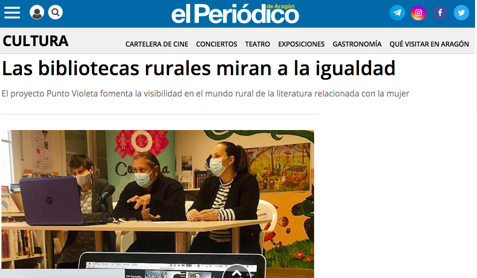 O en El Periódico de Aragón donde se pone de manifiesto, a través del proyecto PUNTO VIOLETA, el papel de la literatura en relación con igualdad y mujer en el mundo rural y, donde las bibliotecas rurales son esas casas, esos refugios, esos espacios de libertad, aprendizaje, ocio… que dan visibilidad.