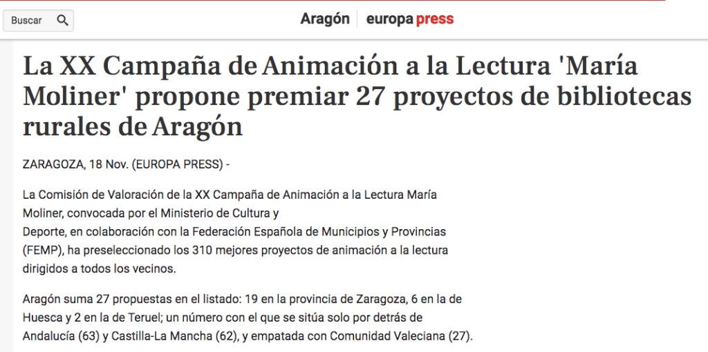 Por todo ello (y más) nos alegra mucho leer noticias como la publicada en Europapress Aragón donde 27 proyectos de bibliotecas rurales de Aragón están dentro de la XX Campaña de Animación a la Lectura «María Moliner» convocada por el Ministerio de Cultura y Deporte en colaboración con la Federación Española de Municipios y Provincias, que valora la originalidad, innovación y las actividades de integración social de la propuesta