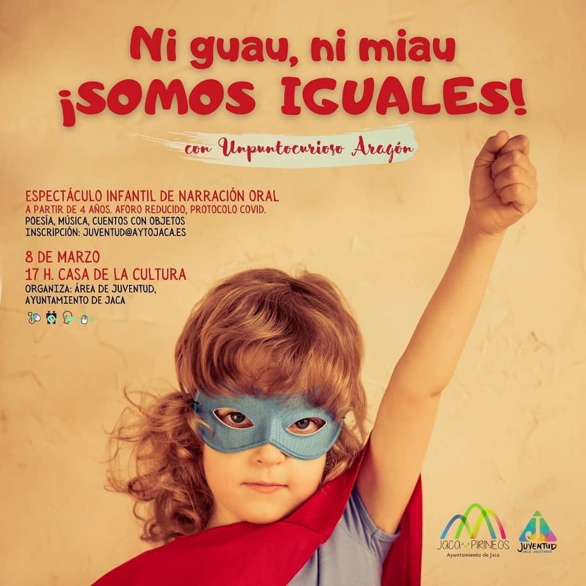 Estamos llenas de emoción (casi no lo podemos creer) de poder seguir trabajando -aunque sea a cuentagotas- de manera presencial. Esta vez lo hacemos gracias al Área de Juventud del Ayuntamiento de Jaca con el espectáculo creado y diseñado para trabajar con familias, niñas y niños, jóvenes, docentes… la igualdad de género NI GUAU, NI MIAU ¡SOMOS IGUALES!
