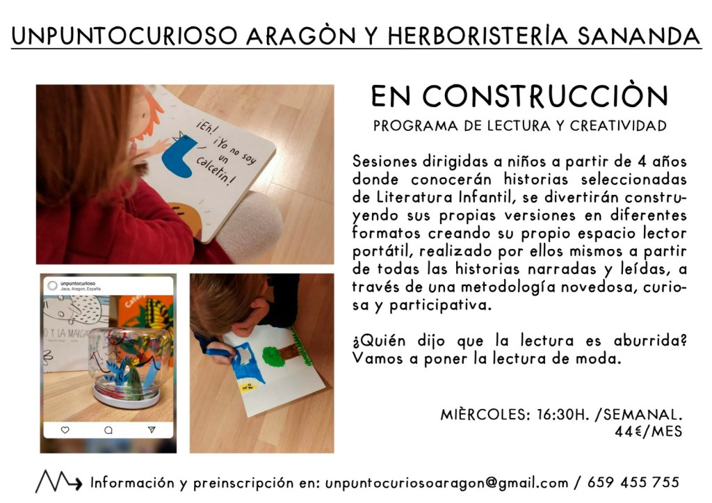 EN CONSTRUCCIÓN (Herboristería Sananda) Taller de lectura y creatividad para seres curiosos a partir de 4 años todos los miércoles a las 16:30h. en Herboristería Sananda (Jaca). Muchas ganas de encontrarnos para continuar disfrutando del placer de leer, explorar, crear, aprender… gracias a los libros y todo lo que nos aportan. ***¡¡QUEDAN PLAZAS!!