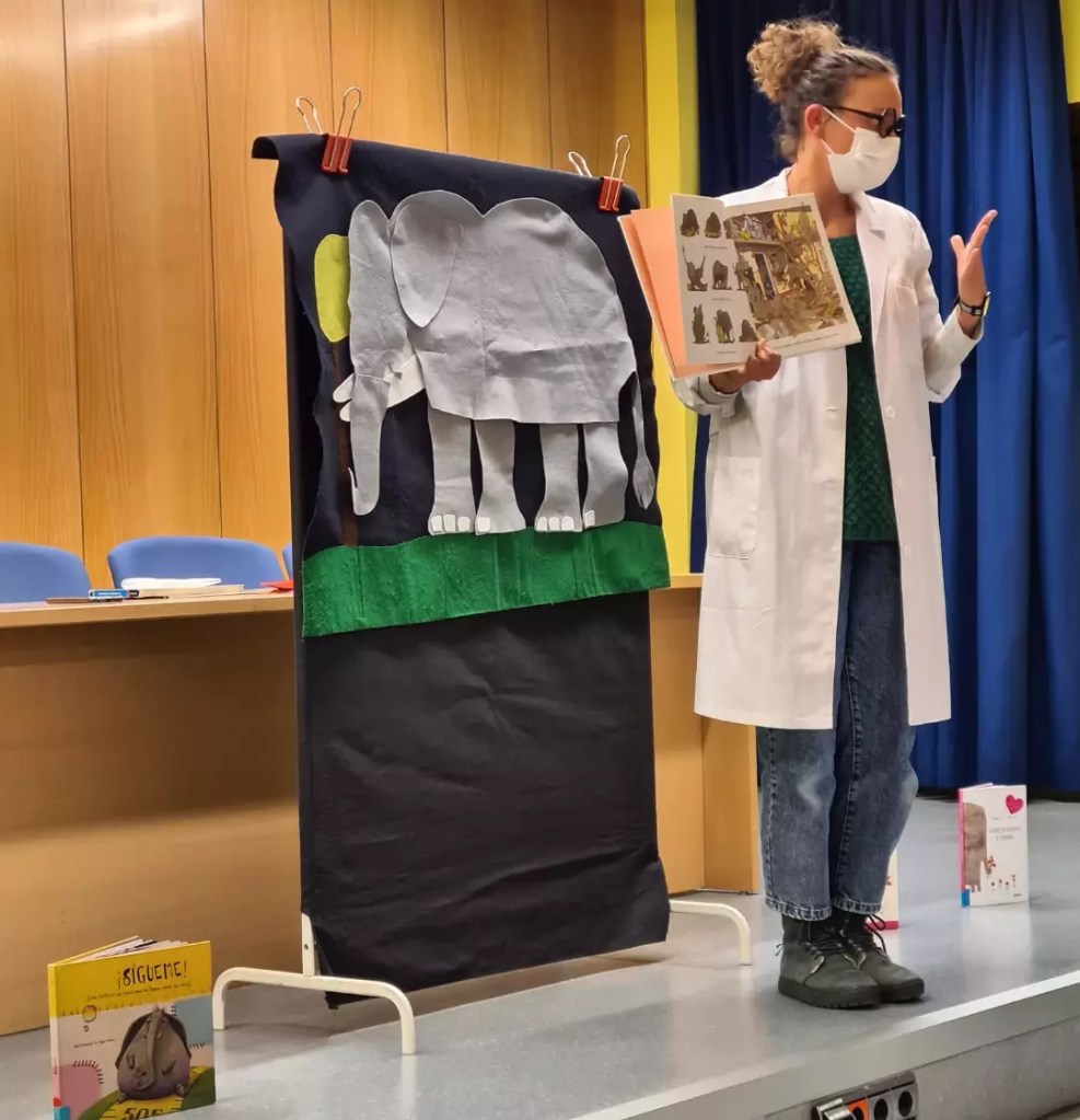 En la sesión de ayer conté un secreto que poca gente sabe. Además de contar cuentos, estudio -desde hace muchos años- a los elefantes.Mis estudios me han llevado a saber porqué los los de color gris (y no blancos o negros); porqué tienen trompa; qué ocurre cuando un elefante se enamora; o porqué mi «gatito» es el más bestia (entre otras muchas cosas). Juntos aprendimos, nos reímos, me ayudaron a contar cuentos… Y en familia, disfrutamos del placer de la lectura.