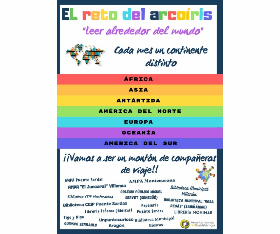 El reto, la propuesta, dirigida a todas las edades consiste en que cada mes había que leer un color del arcoíris. Después, cada participante tenía que elaborar una ficha o pasaporte del lector donde anotaba por mes: título del libro; autor/a; puntuación de 1 a 5 estrellas y sellar su pasaporte o ficha con el sello correspondiente (si el libro te lo ha prestado la biblioteca de Sabiñánigo «Rosa Regás» necesitas su sello. En cambio, si lo has comprado en una de las librerías que forman parte del proyecto, el sello sería de ese establecimiento, etc.).