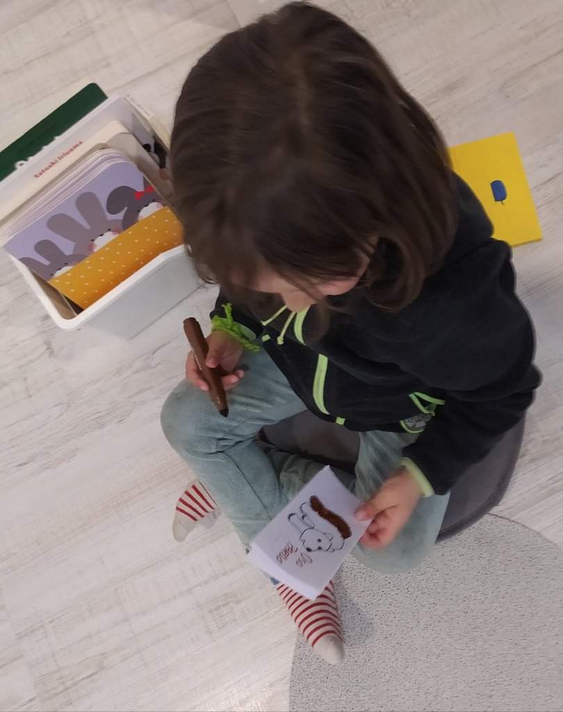 Después, nos hemos creado nuestra propia versión del libro «Oso pardo, oso pardo ¿qué ves?» de Bill Martin / il. Eric Carle. Kókinos y despedido (como no podía ser de otra manera) cantando y contando la canción: «Oso pardo, oso pardo ¿qué ves ahí? Veo… No habían salido por la puerta y ya se la estaban compartiendo con las mamás. ¡¡Maravillos@s!!!