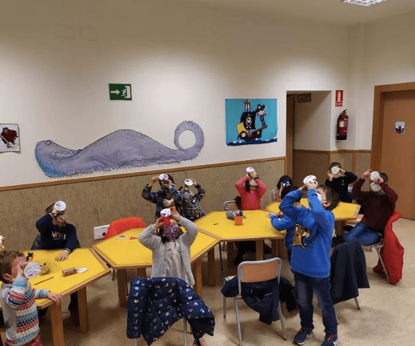A las 10h. CIENTÍFICOS CURIOS@S donde hemos descubierto muchos artilugios y después creado un caleidoscopio. Es fantástico ver sus caras y escuchar lo que han creado ell@s mism@s.