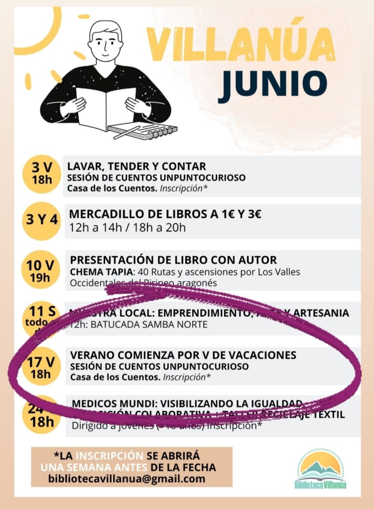 Volvemos a la LA CASA DE LOS CUENTOS DE VILLANÚA (ya sabéis que es una extensión de la Biblioteca de Villanúa) para disfrutar en familia de una nueva sesión de cuentos y creatividad: VERANO COMIENZA POR V DE VACACIONES, a las 18h.
