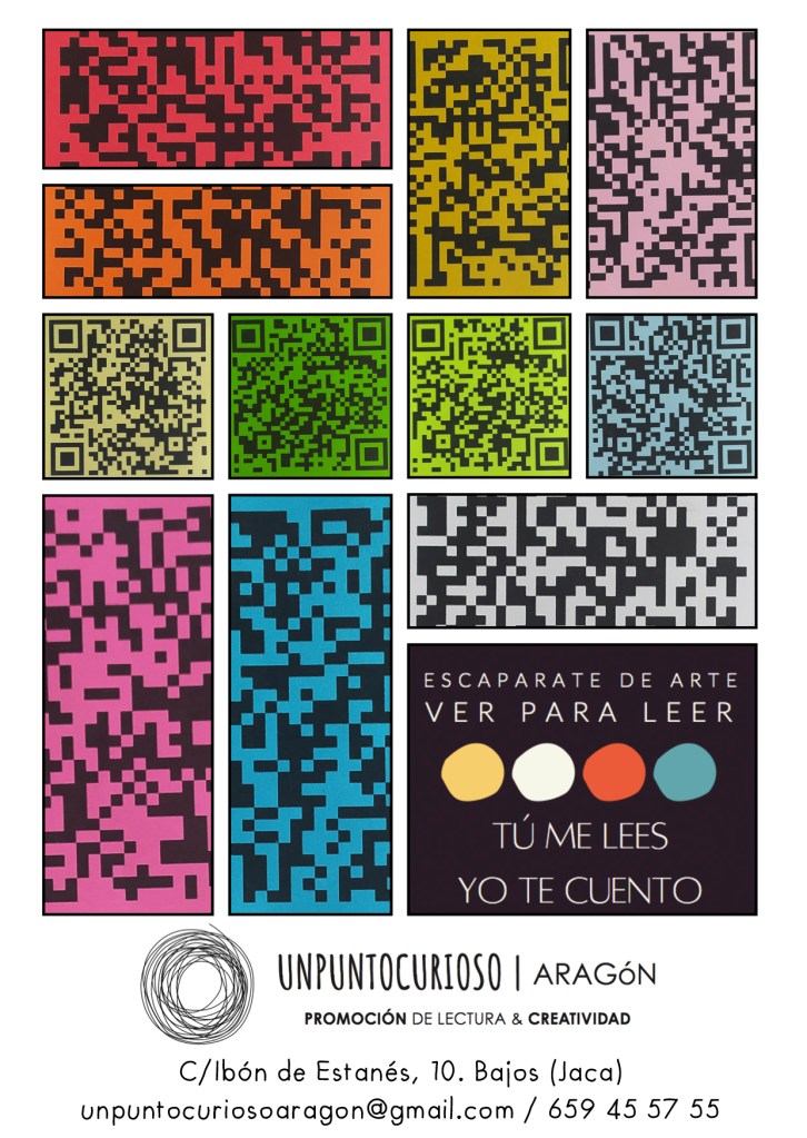 Si quieres que la exposición TÚ ME LEES, YO TE CUENTO de nuestro escaparate de arte Ver para leer llegue hasta tu biblioteca rural, biblioteca escolar, espacio cultural de tu pueblo, junto con los libros físicos escondidos en los códigos QR y una dinamización realizada por Unpuntocurioso Aragón, escríbenos a unpuntocuriosoaragon@gmail.com y te lo contamos todo con detalle.
