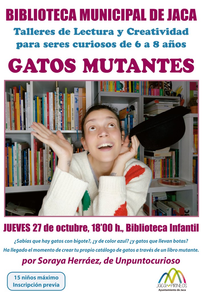 Os recordamos que tenemos una nueva cita en la Biblioteca de Jaca el jueves 27 de octubre, a las 18h. Taller de lectura y creatividad para seres curiosos de 6 a 8 años: GATOS MUTANTES.