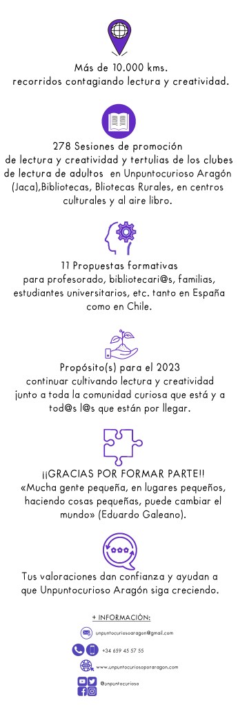 Después de pasar unos días de descanso, en familia y disfrutar juntos de unas Navidades (que no ocurría desde el 2019) hoy, 3 de enero de 2023, Unpuntocurioso Aragón vuelve con muchas ganas de continuar contagiando lectura y creatividad en el medio rural y en el mundo entero.
