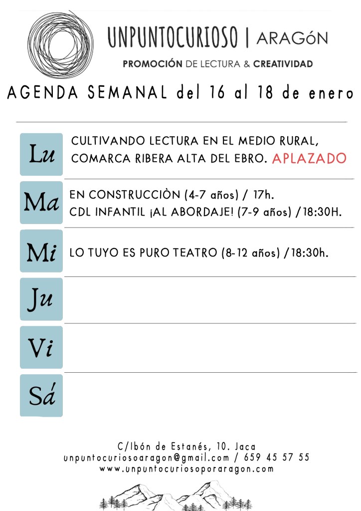 16 enero, 202318 enero, 2023 unpuntocuriosoaragon Agenda semanal del 16 al 18 de enero ¡¡Buenos días nevados!! En el Pirineo Aragonés estamos en ¡¡alerta naranja!! por nevadas por lo que esta semana fría os proponemos contar, crear y compartir al calor de los cuentos y la creatividad, por eso compartimos la AGENDA CURIOSA desde Jaca. Compártelo: Haz clic para compartir en X (Se abre en una ventana nueva) X Haz clic para compartir en Facebook (Se abre en una ventana nueva) Facebook Me gusta Cargando...