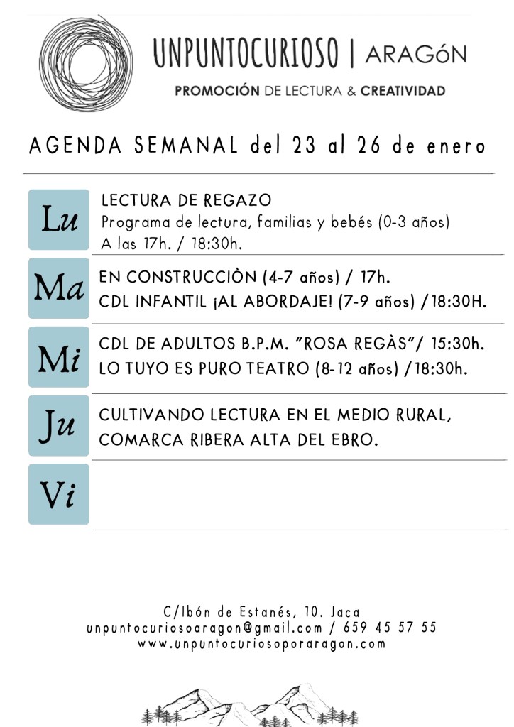 hoy nos levantamos con cielos azules, restos de nieve de la semana pasada, bastante frío helador y desde Unpuntocurioso de Aragón#Jaca queremos disfrutar de nuestro refugio y bosque lector particular junto al calor de grandes amigos, los cuentos. Por eso, compartimos nuestra ¡¡AGENDA DE LA SEMANA!! repleta de propuestas curiosos y lectoras en Jaca, Ayuntamiento de Sabiñánigo, Ribera Alta del Ebro, Biblioteca de Pedrola, Biblioteca de Remolinos, Biblioteca Sobradiel y Biblioteca de Alagón.