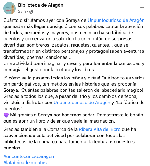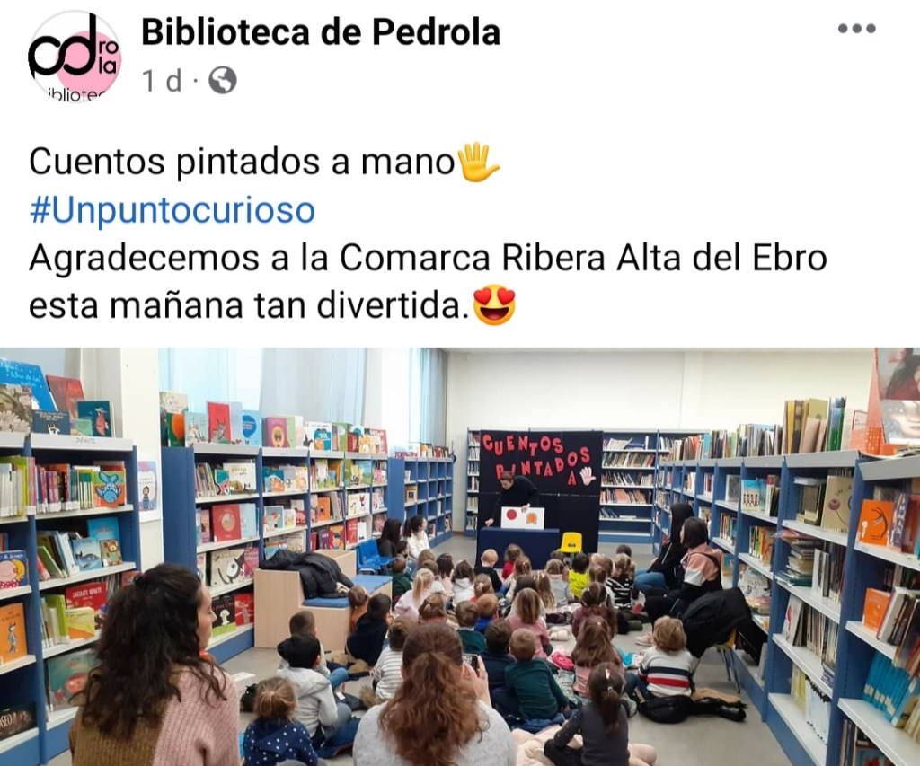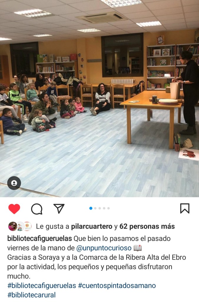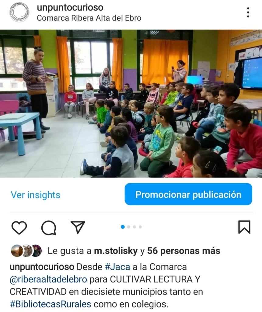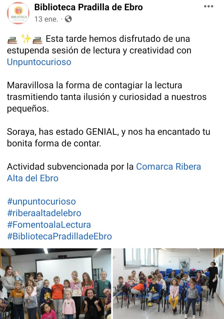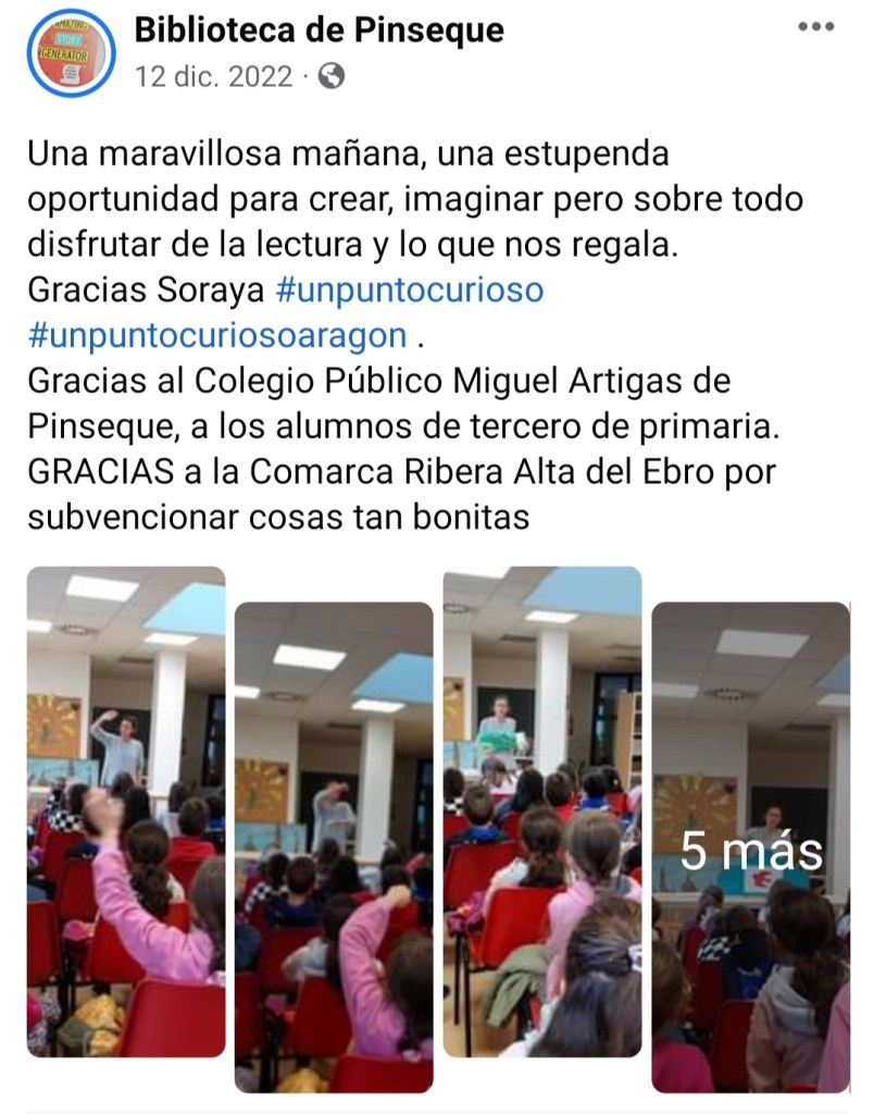 Gracias a La Consejería de Cultura de la Comarca Ribera Alta del Ebro y Unpuntocurioso Aragón (Jaca), hemos llevado sesiones de lectura y creatividad a 17 municipios de la comarca junto a las bibliotecas rurales tanto donde existe este servicio, como en aquellos en los cuales no cuenta, pero se ha realizado en los centros escolares con Educación Infantil y Primaria: Alagón, Alcalá de Ebro, Bárboles, Boquiñeni, Cabañas de Ebro, Figueruelas, Gallur, Grisén, La Joyosa, Luceni, Pinseque, Pedrola, Pleitas, Pradilla de Ebro, Remolinos, Sobradiel y Torres de Berrellén.