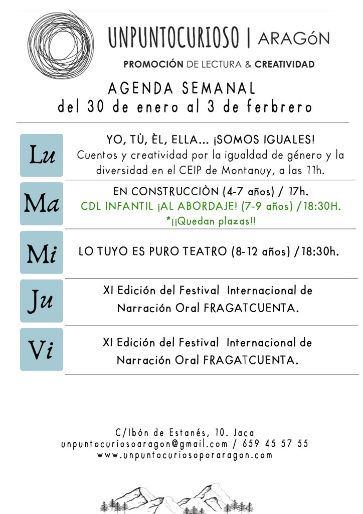 comienza una nueva semana y desde nuestra sede en Jaca, UNPUNTOCURIOSO ARAGÓN compartimos nuestra AGENDA CURIOSA DE LA SEMANA (que comparte los meses de enero y febrero) y, ante estas bajas temperaturas decimos que AL FRÍO: ABRAZOS, LECTURA, CREATIVIDAD Y PUNTO. ¡¡Nos vemos!!