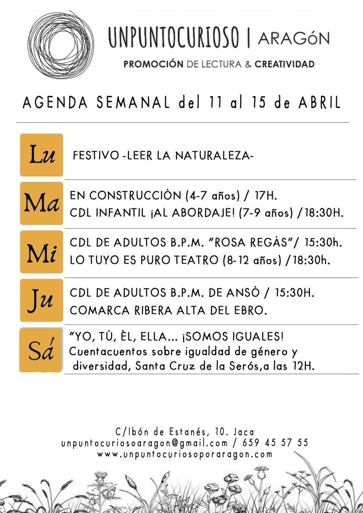 Ay, abril… después de disfrutar de unos días de descanso, LEER LA NATURALEZA y disfrutar de encuentros rurales repletos de cultura en otro idioma (francés), llegan de nuevo los programas de lectura y creatividad de UNPUNTOCURIOSO ARAGÓN para seguir disfrutando junto a tod@s vosotr@s, brotando entre historias, risas, libros, aprendizajes, curiosidad y muchas sorpresas más. ¡¡No se me ocurre un plan mejor!!