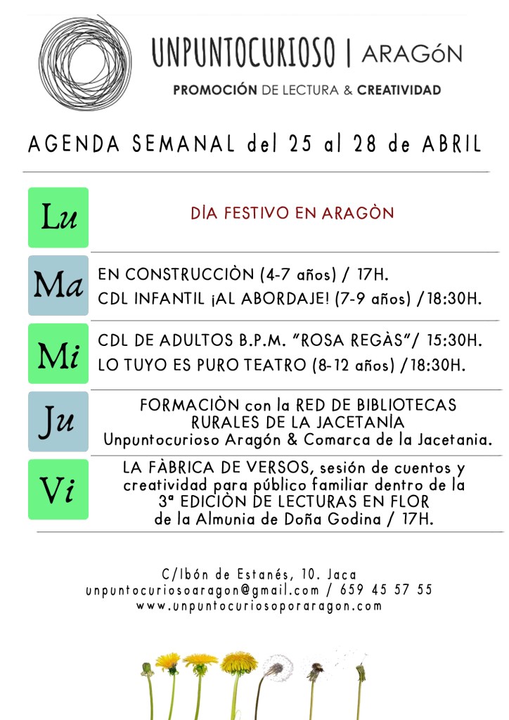 La fiesta de la lectura y la creatividad no para. Ayer celebramos el DÍA DEL LIBRO. Y, hoy, aunque es fiesta en la Comunidad de Aragón, desde nuestro bosque lector y creativo en el Pirineo Aragonés, UNPUNTOCURIOSO ARAGÓN, compartimos nuestra AGENDA SEMANAL con propuestas para contar, crear y compartir junto a todos vosotros, seres curiosos.