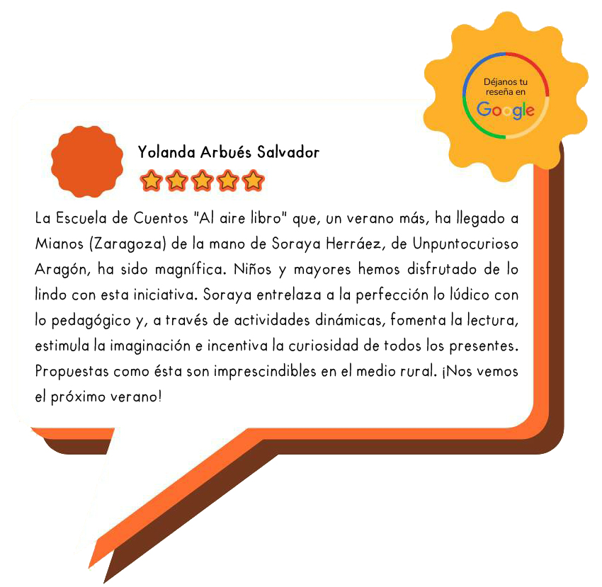 TU OPINIÓN IMPORTA y mucho. Desde Unpuntocurioso Aragón te pido, por favor, que te pases por nuestro espacio en Google y si alguna vez has disfrutado o disfrutas de las propuestas formativas, sesiones de cuentos, programas y/o talleres de creatividad, dejes una reseña -ya sea con palabras o valorando ⭐- el trabajo curioso.