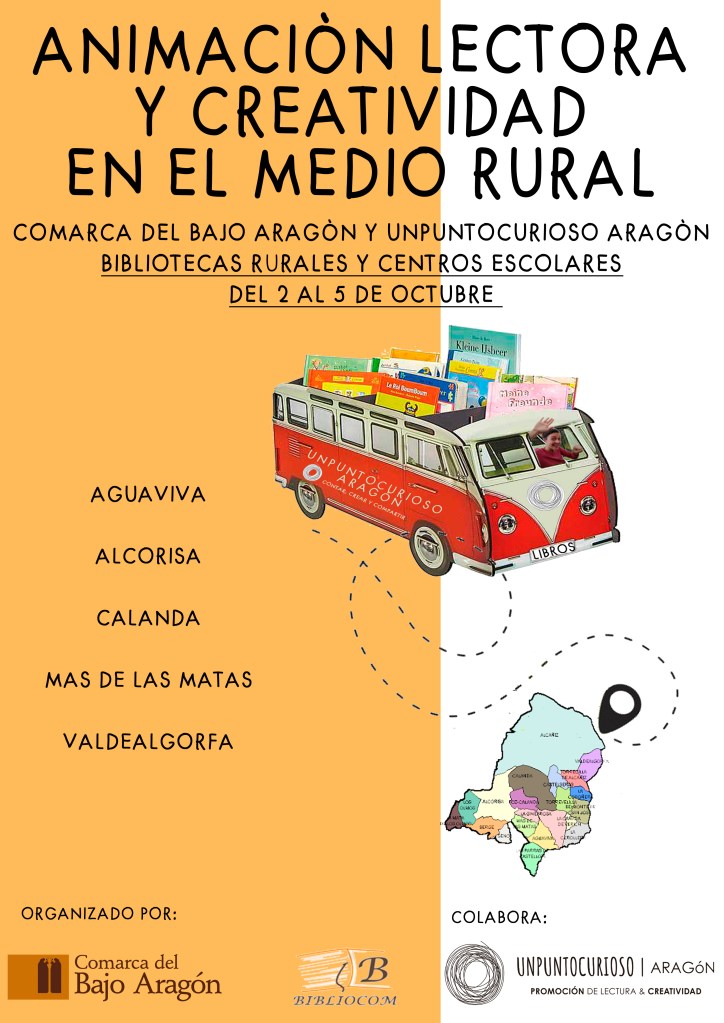 Gracias a La Consejería de Cultura de la Comarca del Bajo Aragón y su campaña comarcal BIBLIOCOM, creada en el 2008 y que financia la realización de actividades de dinamización y promoción de la lectura en las diferentes bibliotecas existentes y en aquellos municipios que no disponen de biblioteca pública; Unpuntocurioso Aragón (Jaca) volvemos a realizar una de las propuestas que más nos gusta: contagiar lectura y creatividad en el medio rural junto a las bibliotecas rurales en escuelas infantiles, centros escolares (con Educación Infantil y Primaria) y centros de personas mayores de los municipios de Aguaviva, Alcorisa, Calanda, Mas de la Matas y Valdealgorfa, del 2 al 5 de octubre.