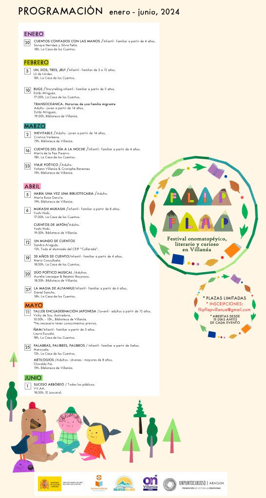 Más de 400 personas: niñ@s, familias, jóvenes y adultos han podido disfrutar de la I edición de FLIP FLAP, colgando el cartel de COMPLETO en el 95% de las propuestas programadas (y dejando en lista de reserva con mucha pena a 100 personas aproximadamente) desarrolladas para público infantil y familiar en La Casa de los Cuentos de Villanúa y para público juvenil y adulto en la Biblioteca de Villanúa.