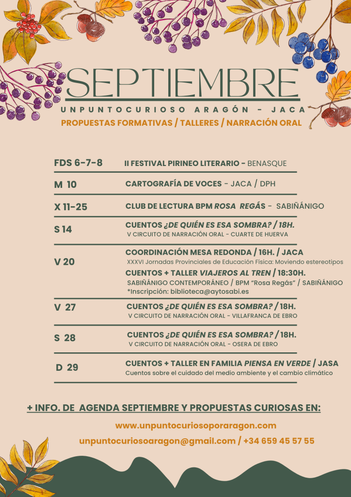 desde la sede UNPUNTOCURIOSO ARAGÓN en los Pirineos (Jaca) queremos compartir la AGENDA MENSUAL con todas las propuestas de promoción de lectura y creatividad: formación, narración, programas desarrollados en diferentes bibliotecas, talleres, etc.