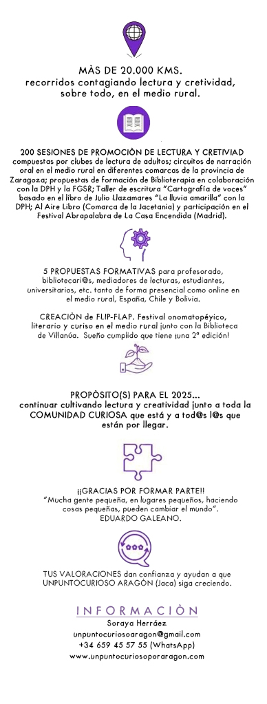 Estos días de vacaciones navideñas están siendo días de encuentro familiar, de reflexión, de comenzar con nuevos proyectos que «renta» mi creatividad, alma y vida personal. Hoy, 5 de enero de 2025, UNPUNTOCURIOSO ARAGÓN vuelve con muchas ganas de continuar contagiando lectura y creatividad en el medio rural y en el mundo entero.