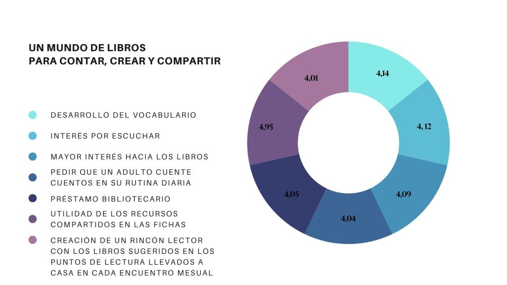 A finales de curso se ha entregado a las familias un cuestionario donde responder diferentes cuestiones en base a lo trabajado y disfrutado al programa UN MUNDO DE CUENTOS desarrollado en las aulas valorando del 1 al 5, siendo 1 «nada» y 5 «mucho». Los resultados que comparto a continuación se han obtenido de los 90 cuestionarios cumplimentados por las familias implicado en la propuesta: